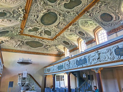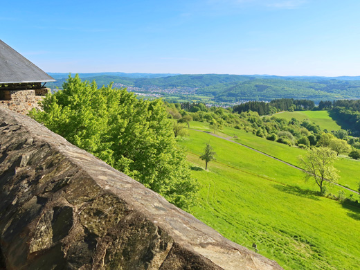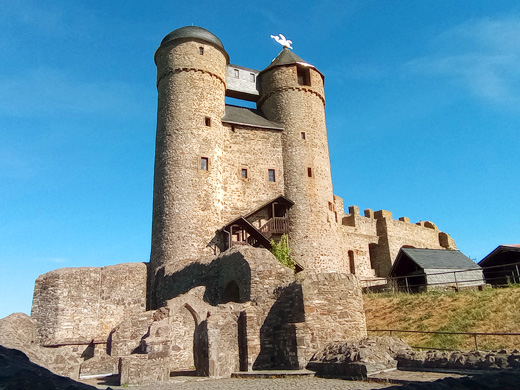 Die herausragenden, charakteristischen Doppeltürme, die einen Verbindungsgang aufweisen, durften sogar bestiegen werden, um u. a. – nun von einem wesentlich höheren Standort aus – die Weitsicht über den westlichen Westerwald und das Gladenbacher Bergland zu bestaunen. Über die Kasematten erreichte man die aus der Mitte des 15. Jahrhunderts stammende gotische Unterkirche, die Katharinenkapelle. Ihr aufgesetzt – als Doppelkapelle – erscheint die Barockkirche, die unter Graf Wilhelm Moritz zu Solms-Greifenstein ab 1683 erbaut wurde und im Innern mit prunkvollem Stuck vor allem an der Decke und entlang ihrer Empore ausgestattet ist. Unterhalb der Orgel sind farbenfroh die fürstlichen Wappen wiedergegeben.