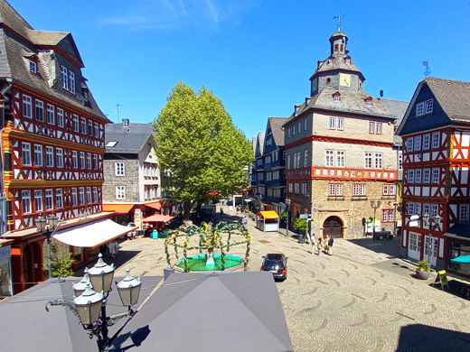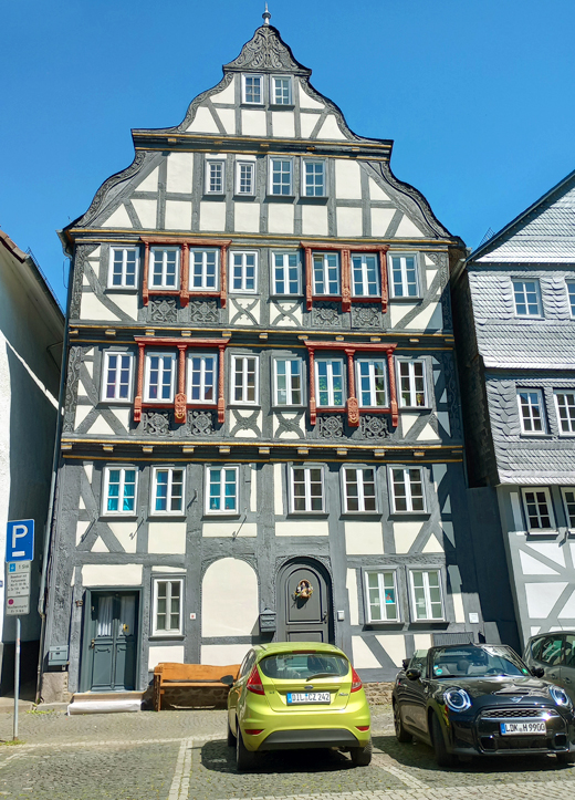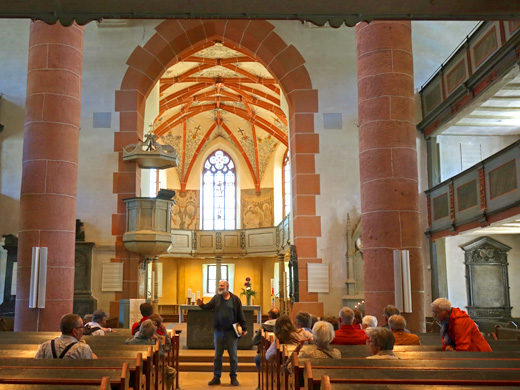Im Anschluss erfolgte die Weiterfahrt zur an der Dill gelegenen Stadt Herborn, ein Mittelzentrum, in dem zunächst eine individuelle Mittagspause eingelegt wurde. Unmittelbar danach begann in zwei Gruppen eine Führung durch die historische Altstadt, die von den Herren Dr. Horst Becker und Dr. Jörg Wegerhoff übernommen wurde. In intensiver und sehr informativer Weise wurde dabei auf die Stadtgeschichte eingegangen und unter Vorstellung historischer Objekte deren Entwicklung und Baubestand erläutert. Hierzu gehörten das Rathaus, das nach dem Brand von 1626 wieder errichtet wurde, mit dem umlaufenden Wappenfries, das erstmalig 1350 erwähnte Schloss, heute Sitz des Theologischen Seminars der Evangelischen Kirche Hessen-Nassau, die mittelalterliche evangelische Stadtkirche, die zeitweise dem Deutschen Orden gehörte, die Hohe Schule (Academia Nassauensis), eine von Johannes VI., dem Bruder von Wilhelm von Oranien, gegründete Einrichtung der wichtigsten Bildungsstätten der calvinistisch Reformierten in Europa, sowie zahlreiche Fachwerk- und schieferverkleidete Häuser.