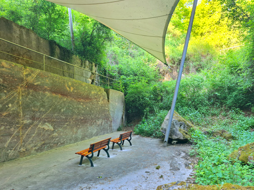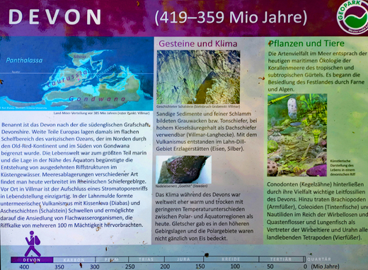 Auf dem 380 m langen erdgeschichtlichen Pfad, der einer geologischen Zeitreise von 380 Mio. Jahren seit dem Mitteldevon entsprechen soll, weisen Tafeln mit Abbildungen und ausführlichem Erläuterungstext auf die einzelnen Formationen vom Kambrium bis zum Quartär hin.