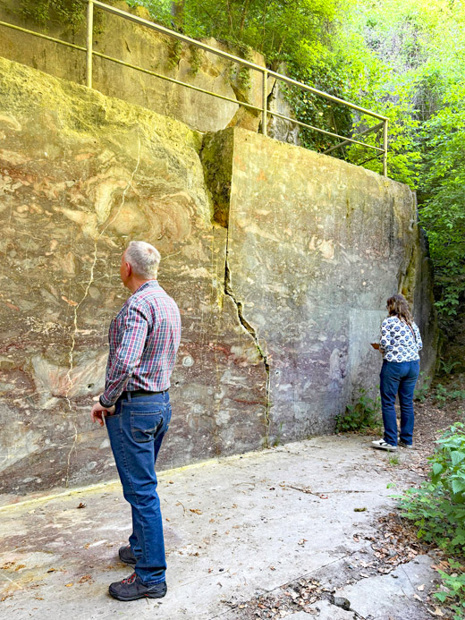 Am Unica-Steinbruch angekommen steht man vor einer eindrucksvollen, 15 m langen und 6 m hohen glattgesägten und fein geschliffenen Gesteinswand, einem geologischen wie petrographischen Kleinod. Die teils schwungvolle Textur und Vielfarbigkeit dieser Aufschlusswand erlaubt einen einmaligen Einblick in ein mitteldevonisches Stromatoporen-/Korallenriff, das bei genauerem Hinsehen auch Seelilien, Kopffüßler, Schnecken und Brachiopoden beinhaltet. Aus dem Aufbau der Wand und ihrem breiten Farbspektrum lassen sich Rückschlüsse auf das jeweilige Ausgangsmaterial als auch auf die Entwicklung und Störungsphasen schließen.