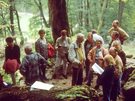 Desgleichen auch im Bereich des Albguts Lindenhof. An dieser Stelle ging Prof. Pfeffer vorrangig auf die Besiedlung der Alb, die Hügelgräber und den Bohnerzabbau zu keltischer Zeit ein. Über Bleichstetten führte die Strecke zurück nach Bad Urach, wo jeder Teilnehmer die Mittagspause individuell gestalten konnte.