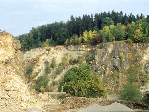(An dieser Stelle gratulierte der LV seinem ehemaligen, langjährigen Schriftführer Helmut Uhrig zum 65. Geburtstag!). Wieder zurück am Bus wurde die Fahrt über Dettingen, Metzingen und Eningen bis zum Rand des Albaufstiegs fortgesetzt. Von der Eninger Steige aus war es möglich, vorrangig in westliche Richtung das Albvorland in der Umgebung von Eningen mit dem herausragenden 707,1 m hohen Zeugenberg Achalm sowie im Hintergrund den knapp 602 m hohen Vulkanschlot des Georgenbergs zu beobachten. Südwestlich des Standorts war deutlich der Stufenrand der Alb festzustellen. Erklärt wurde hier das Nutzungsmuster des Albanstiegs mit den Siedlungen und Feldfluren, den Streuobstwiesen mit Freizeitanlagen sowie den Waldgebieten am Steilanstieg. Der nächste Halt am großen Steinbruch des Renkenbergs diente der Vorstellung mächtiger Riffstutzen.
