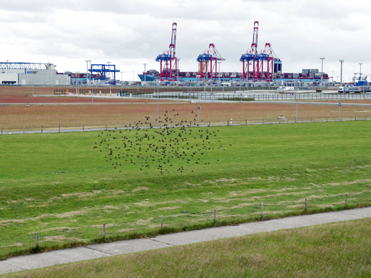 Auf der nun folgenden Strecke waren der nacheiszeitliche Meeresspiegelanstieg, die Sturmfluten und die Entwicklung des Jadebusens die angesprochenen Themen. Der JadeWeserPort Wilhelmshaven auf der Westseite des Jadebusens war das nächste Ziel. Im InfoCenter wurde eine interaktive Ausstellung besichtigt und zur Einführung ein Film vorgeführt. Nach nahezu 5-jähriger Bauzeit ist der Hafen seit September 2012 als Deutschlands einziger Container-Tiefwasserhafen in Betrieb. Als Baugrund wurden der Jade ca. 46 Mio. m³ Sand entnommen und aufgespült, wodurch eine rund 360 ha große ebene Fläche entstand. Von der Aussichtsterrasse auf dem Dach des InfoCenters ist die gesamte Anlage gut zu überblicken, auffallend waren besonders die hohen Containerbrücken.