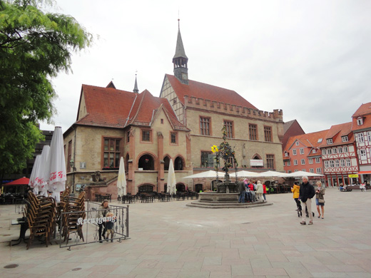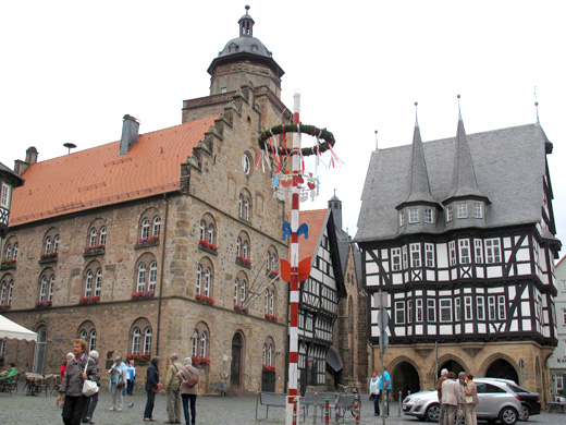 Darüber hinaus schmücken die doppeltürmige Pfarrkirche St. Johannis, die Jacobikirche, St. Marien sowie zahlreiche gut erhaltene Fachwerkhäuser den Innenstadtbereich. Die 1737 gegründete Georg-August-Universität ist, historisch bedingt, auf mehrere Gebäude der Stadt verteilt. Leider wirkte Göttingen am Sonntagmittag wie ausgestorben, ganz im Gegensatz zur lebendigen Wochentagsatmosphäre, die die Gruppe in Münster erlebt hatte. Viele Restaurationsbetriebe waren geschlossen. Der Ratskeller bot ein angenehmes Ambiente, so dass sich die meisten der Reisegruppe dort wiederfanden. Die anschließende Fahrt führte durch das Hessische Bergland bis zum nächsten Halt in Alsfeld, ein am nordwestlichen Rand des Vogelsbergs gelegenes Städtchen, das sich wegen seines prächtigen Fachwerkensembles auszeichnet.
