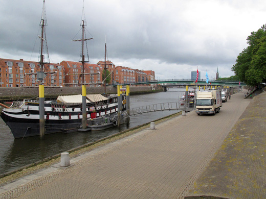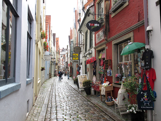Danach – der Regen hatte nachgelassen – begab man sich zum Schnoor, ein ehemaliges Kleinhandwerkerviertel, das seine Bezeichnung dem Schiffshandwerk verdankt und zwischen der Balge, einem heute verrohrten, parallel zur Weser fließenden Flüsschen, und der Weser liegt. Am nordwestlichen Rand dieses Quartiers steht die ehemalige Klosterkirche St. Johann, ein aus der Backsteingotik stammender Bau. Das Viertel besteht überwiegend aus kleinen engen Gassen gesäumt von kleinen Häusern, deren älteste aus dem 16. Jh. stammen. Neben kleinen Lädchen mit Kunsthandwerk, Antiquitäten und Lebensmittel gibt es Kneipen, Cafés und Restaurants, ein idealer Platz also, um hier die Gruppe in ihre Mittagspause zu entlassen.