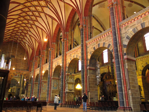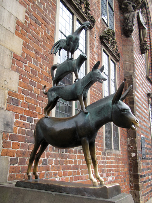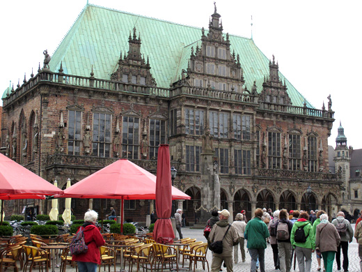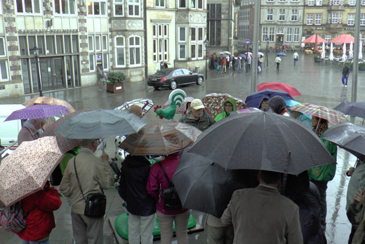 Die 1404 auf dem Platz errichtete Rolandsfigur ist das Wahrzeichen Bremens und die höchste freistehende Statue des deutschen Mittelalters; seit 2004 gehört sie mit dem Rathaus zum UNESCO Weltkulturerbe. Zusammen mit den Bremer Stadtmusikanten ist sie für Touristen zweifellos das beliebteste Fotoobjekt. Ein plötzlich einsetzender Platzregen zwang die Gruppe als Nächstes das Innere des eindrucksvollen Doms zu besichtigen.